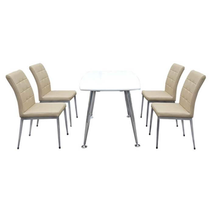 Bộ bàn ghế ăn cao cấp khung thép mạ. Mặt bàn gỗ công nghiệp được phủ sơn PU cao cấp màu trắng bóng tạo cho sản phẩm sự nhẹ nhàng, thanh thoát. Đệm tựa ghế bọc PVC có may trang trí. Kích thước bàn B68: W1300xD800xH750. Kích thước ghế G68: W420xD555xH890.