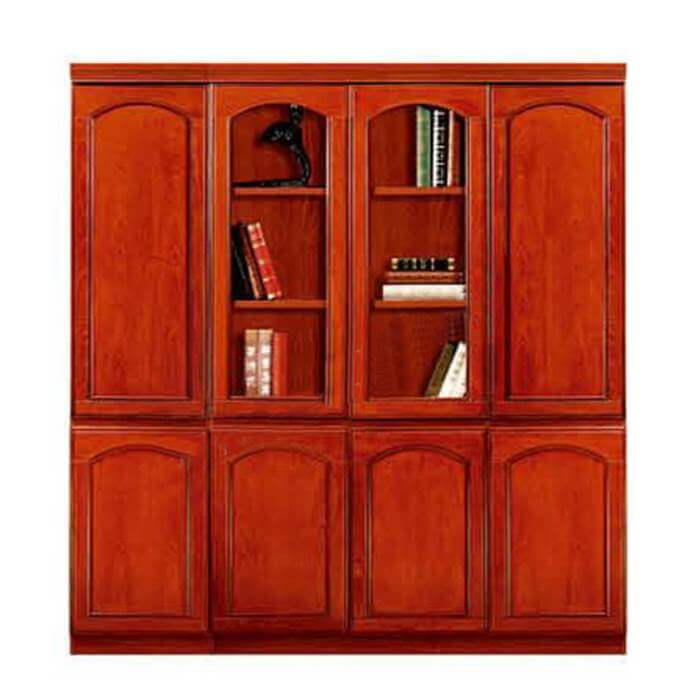 Tủ tài liệu 4 buồng chất liệu veneer, khoang trên 2 cánh kính, 2 cánh kín, khoang dưới 4 cánh kín. Kích thước: W1600xD400xH2000.